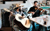 New Mexico has long been a crossroads not only of cultures, but of eras—a place where ancient ways of being exist alongside modern life. The oldest strands of New Mexican traditional music began to become scarce in the 1950s when New Mexico was rapidly and at times forcibly integrated into the American economic and cultural environment. But testaments and bridges to this older world have remained in recordings, photos, and most importantly in the living memory of elders. The musicians of Lone Piñon—Noah Martinez (bajo quinto, quinta huapanguera, guitar, tololoche, guitarrón, electric bass) and Jordan Wax (violin, piano- and two-row accordions, mandolin, guitar, vocals)—were lucky enough to be initiated early in their musical path into the traditions of elder musicians, who instilled in them a respect for continuity and an example of the radicalism, creativity, and cross-cultural solidarity that has always been necessary for musical traditions to adapt and thrive in each generation. In 2014, they formed Lone Piñon in an effort to find and strengthen the oldest strands of New Mexico string music, sounds that had all but disappeared from daily life. Through relationship with elders, study of field recordings, and connections to parallel traditional music and dance revitalization movements in the US and Mexico, they have brought the language of New Mexico traditional music and related regional traditions back onto the modern stage, back onto dance floors, and back into the ears of a young generation.
